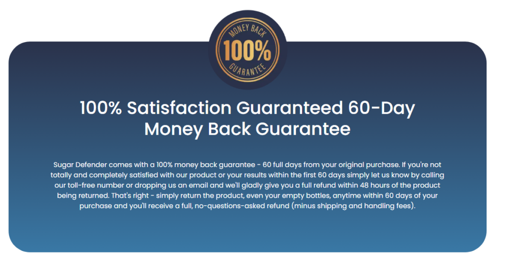 Sugar Defender comes with a 100% money back guarantee – 60 full days from your original purchase. If you’re not totally and completely satisfied with our product or your results within the first 60 days simply let us know by calling our toll-free number or dropping us an email and we’ll gladly give you a full refund within 48 hours of the product being returned. That’s right – simply return the product, even your empty bottles, anytime within 60 days of your purchase and you’ll receive a full, no-questions-asked refund (minus shipping and handling fees).